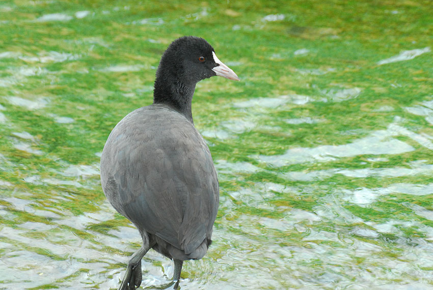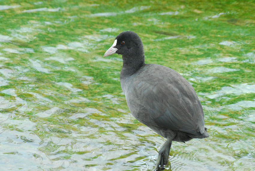 水路にて。なぜか逃げないな、と思ったら左足を悪くしてびっこを引いていたオオバン。